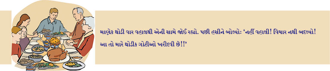 માણેક થોડી વાર વહાલથી એની સામે જોઈ રહ્યો. પછી હસીને બોલ્યો: ‘નહીં વહાલી! વિચાર નથી બદલ્યો! આ તો મારે થોડીક ગોટીઓ ખરીદવી છે!!’