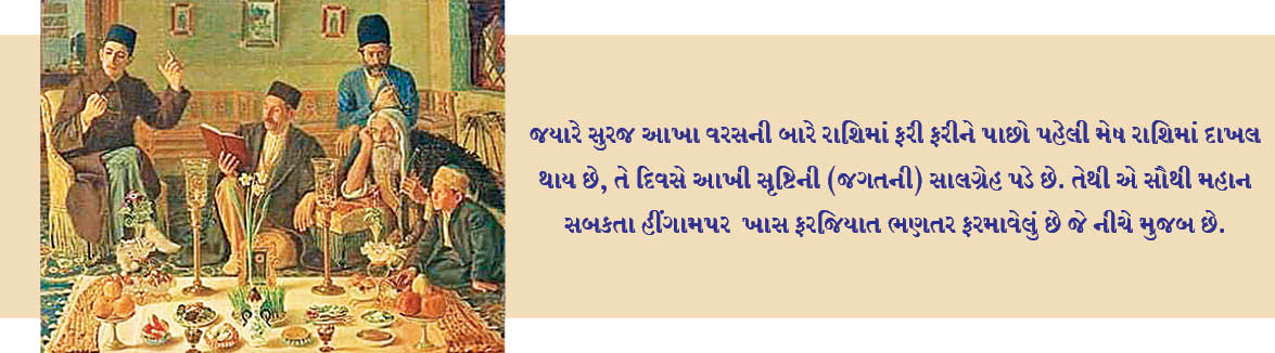 જયારે સુરજ આખા વરસની બારે રાશિમાં ફરી ફરીને પાછો પહેલી મેષ રાશિમાં દાખલ થાય છે, તે દિવસે આખી સૃષ્ટિની (જગતની) સાલગ્રેહ પડે છે. તેથી એ સૌથી મહાન સબકતા હીંગામપર ખાસ ફરજિયાત ભણતર ફરમાવેલું છે જે નીચે મુજબ છે