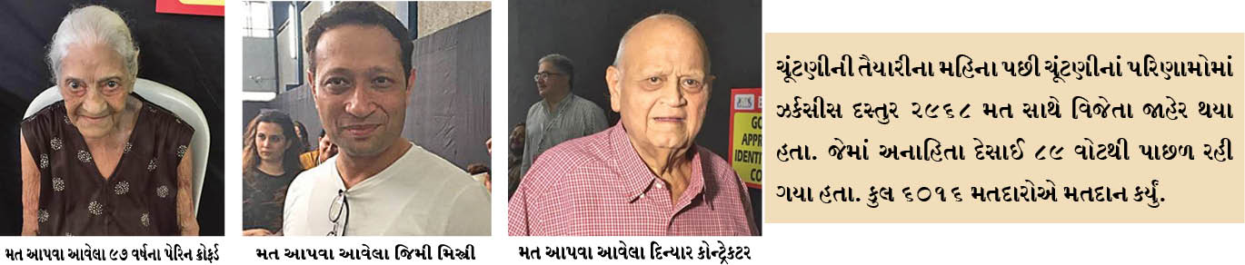 ચૂંટણીની તૈયારીના મહિના પછી ચૂંટણીનાં પરિણામોમાં ઝર્કસીસ દસ્તુર 2968 મત સાથે વિજેતા જાહેર થયા હતા. જેમાં અનાહિતા દેસાઈ 89 વોટથી પાછળ રહી ગયા હતા. કુલ 6016 મતદારોએ મતદાન કર્યું.