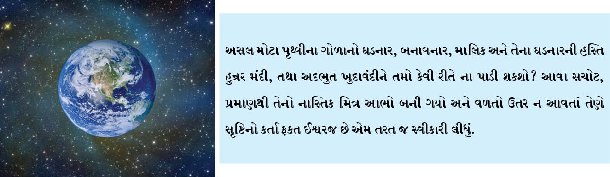 સુપ્રસિધ્ધ ખગોળ શાસ્ત્રી કિચ્ચરને ભુગોળ-ખગોળ વિદ્યાનું પૂરેપુરૂં જ્ઞાન પ્રાપ્ત થયું ત્યારે તેને પ્રતિતી થઈ કે વિશ્ર્વની કોઈ બ્રહ્મ જેવી પરમ શક્તિ હાથ છે જ જ્યારે તેનો મિત્ર વિશ્ર્વને બનાવનાર પરમેશ્ર્વર જેવા કોઈ નથી તેમ માને છે. સૃષ્ટિની રચના આપોઆપ થઈ છે અને તેને કોઈએ બનાવી નથી એવો મતવાળો હતો. અનેક પ્રમાણો આપી. કિચ્ચર પોતાના મિત્રને ખગોળ વિદ્યાના આધારે ખુબ સમજાવતો. તો પણ કાર્ય, કારણ અને કર્તાનો સિધ્ધાંતમાં તે માનતો નહીં. એવા કટ્ટર નાસ્તિક માટે ઈશ્ર્વરને મનાવના ઈરાદાથી કિચ્ચર એક ભારે કીંમતનો પૃથ્વીનો નમૂનેદાર ગોળો બજારમાંથી ખરીદયો. તેના ઉપર જુદા જુદા દેશો ઉપરાંત નક્ષત્ર મંડળ ચીતરેલુ હતું. તે ગોળાને શોભા માટે દીવાન ખાનામાં ગોઠવ્યો. બીજે દિવસે તેનો મિત્ર આવી ચઢયો અને દીવાનખાનામાં શોભતા, રંગીન, ઝગમગતા પૃથ્વીના ગોળા પર પડતા જ પૂછવા લાગ્યો કે આવો અતિ સુંદર પૃથ્વીનો ગોળો કયાંથી આવ્યો? એનો માલીક કોણ છે? એની કલ્પના કોના ભેજામાંથી નીકળી, અને એ ઉત્તમ કારિગરનું નામ -ઠામ જાણવાની ઉત્કંડા જણાવી. કિચ્ચરે ઠંડે કલેજે, મંદ આવકારથી જવાબ આપ્યો કે આ ગોળો કયાંથી આવ્યો, કોણ લાવ્યો કોની માલીકીનો છે. કોણે બનાવ્યો છે એ બાબત વિશે કંઈ જાણતો નથી. હું માનું છું કે એને કોઈએ બનાવ્યો જ નથી. એ તો માત્ર દૈવી કૃપાથી અહીં આવી ચઢેલો જણાય છે. એનો કર્તા જેમ કોઈ નથી. તેમ તેનો માલિક પણ કોઈ નથી. ઉશ્કેરાઈને ઈશ્ર્વરના અસ્તિત્વ વિશે અશ્રધ્ધાળું મિત્ર બોલી ઉઠયો. નહીં નહીં મારા સાહેબ, તમે જે કારણ જણાવો છો તે બધાજ અશકય કહી શકાય. આ ગોળો ઉત્તમ કારિગરીનો નમૂનો છે અને તેનો કોઈ ધણી નથી અને તે એની મેળેજ અહીં આવી ચઢયો છે. આવી અશકય વાતો કરી મારી મશ્કરી ઉડાવો છો. કિચ્ચરે ખૂબ જ સાવધાની પૂર્વક જવાબ આપ્યો કે આ નાની નિર્જીવ વસ્તુ એક તુચ્છ ગોળો માત્ર દેવ યોગેજ નહીં હોવો જોઈએ એમ જ્યારે તમો દ્રઢતાથી માનો છો ત્યારે જ ગગન-મંડળો જે પૃથ્વી જે વિશ્ર્વ જે મહાન દૈવી શક્તિથી ઉત્પન્ન થયા છે તે માત્ર અસલ પૃથ્વીના ગોળાની નકલ છે. અસલ મોટા પૃથ્વીના ગોળાનો ઘડનાર, બનાવનાર, માલિક અને તેના ઘડનારની હસ્તિ હુન્નર મંદી, તથા અદભુત ખુદાવંદીને તમો કેવી રીતે ના પાડી શકશો? આવા સચોટ, પ્રમાણથી તેનો નાસ્તિક મિત્ર આભો બની ગયો અને વળતો ઉતર ન આવતાં તેણે સૃષ્ટિનો કર્તા ફકત ઈશ્ર્વરજ છે એમ તરત જ સ્વીકારી લીધું.