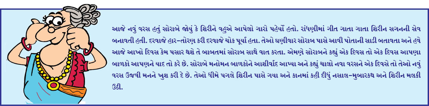 આજે નવું વરસ હતું સોરાબે જોયું કે શિરીને વહુએ આપેલો ગારો પહેર્યો હતો. રાંધણીમાં ગીત ગાતા ગાતા શિરીન સગનની સેવ બનાવતી હતી. દરવાજે હાર-તોરણ કરી દરવાજે ચોક પૂર્યા હતા. તેઓ ઘણીવાર સોરાબ પાસે આવી પોતાની સાડી બતાવતા અને હવે આજે આખો દિવસ કેમ પસાર થશે તે બાબતમાં સોરાબ સાથે વાત કરતા. એમણે સોરાબને કહ્યું એક દિવસ તો એક દિવસ આપણા બાળકો આપણને યાદ તો કરે છે. સોરાબે મનોમન બાળકોને આશીર્વાદ આપ્યા અને કહ્યું ચાલો નવા વરસને એક દિવસે તો તેઓ નવું વરસ ઉજવી મનને ખુશ કરી દે છે. તેઓ ધીમે પગલે શિરીન પાસે ગયા અને કાનમાં કહી દીધું નસાલ-મુબારકથ અને શિરીન મલકી ઉઠી.