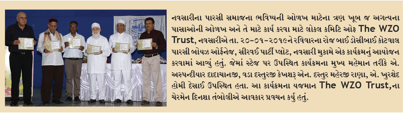 નવસારીના પારસી સમાજના ભવિષ્યની ઓળખ માટેના ત્રણ ખૂબ જ અગત્યના પાસાઓની ઓળખ અને તે માટે કાર્ય કરવા માટે લોકલ કમિટિ ઓફ The WZO Trust  નવસારીએ તા. 20-01-2019ને રવિવારના રોજ બાઈ ડોસીબાઈ કોટવાલ પારસી બોયઝ ઓર્ફનેજ, સીરવઈ પાર્ટી પ્લોટ, નવસારી મુકામે એક કાર્યક્રમનું આયોજન કરવામાં આવ્યું હતું. જેમાં સ્ટેજ પર ઉપસ્થિત કાર્યક્રમના મુખ્ય મહેમાન તરીકે એ. અસ્પન્દીયાર દાદાચાનજી, વડા દસ્તુરજી કેખશરૂ એન. દસ્તુર મહેરજી રાણા, એ. ખુરશેદ હોમી દેસાઈ ઉપસ્થિત હતા. આ કાર્યક્રમના યજમાન The WZO Trustના ચેરમેન દિનશા તંબોલીએ આવકાર પ્રવચન કર્યુ હતું.