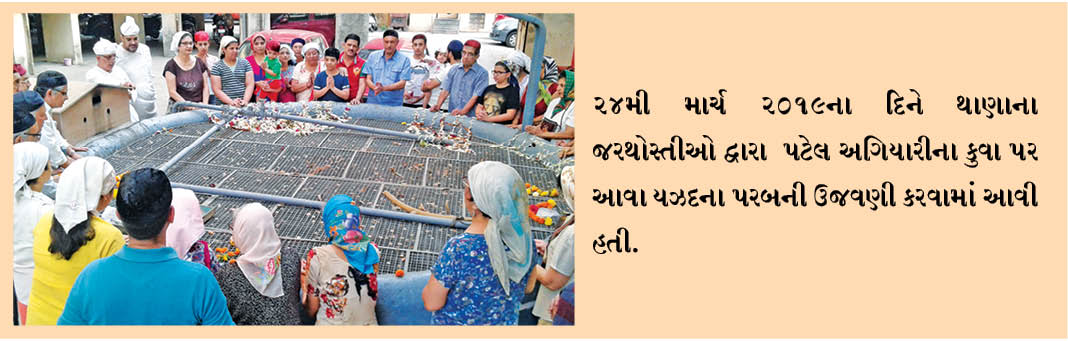 24મી માર્ચ 2019ના દિને થાણાના જરથોસ્તીઓ દ્વારા પટેલ અગિયારીના કુવા પર આવા યઝદના પરબની ઉજવણી કરવામાં આવી હતી. જશનની પવિત્ર ક્રિયા સાંજે સ્ટે.ટા. 5.00 કલાકે એરવદ કેરસી સિધવા અને એરવદ આદિલ દસ્તુર દ્વારા કરવામાં આવી હતી. દસ્તુરજીની આગેવાની હેઠળ હમદીનોએ કુવા પર પ્રાર્થના કરી હતી. હમબંદગીમાં યુવાનોએ ઉત્સાહપૂર્વક ભાગ લીધો હતો જે નિયમીત મુલાકાતીઓ પણ નહોતા તે જોઈ આનંદ થયો હતો. દાળની પોળી તથા ફળો ચાશની તરીકે લોકોને આપવામાં આવ્યા હતા. આવા અરદવીશુરબાનુના આશિર્વાદ લઈ લોકો છૂટા પડયા હતા.