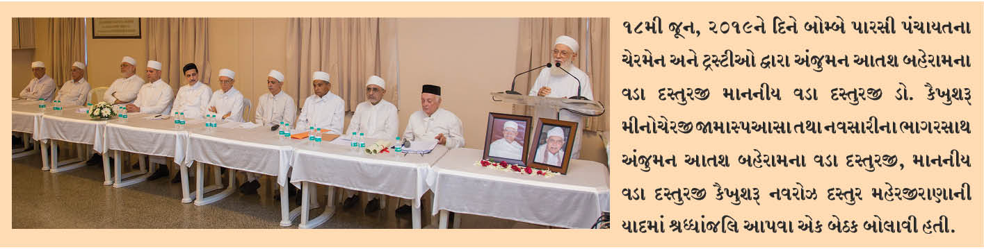 18મી જૂન, 2019ને દિને બોમ્બે પારસી પંચાયતના ચેરમેન અને ટ્રસ્ટીઓ દ્વારા અંજુમન આતશ બહેરામના વડા દસ્તુરજી માનનીય વડા દસ્તુરજી ડો. કૈખુશરૂ મીનોચેરજી જામાસ્પઆસા તથા નવસારીના ભાગરસાથ અંજુમન આતશ બહેરામના વડા દસ્તુરજી, માનનીય વડા દસ્તુરજી કૈખુશરૂ નવરોઝ દસ્તુર મહેરજીરાણાની યાદમાં શ્રધ્ધાંજલિ આપવા એક બેઠક બોલાવી હતી.