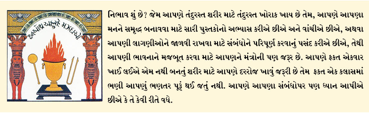 નિભાવ શું છે? જેમ આપણે તંદુરસ્ત શરીર માટે તંદુરસ્ત ખોરાક ખાય છે તેમ, આપણે આપણા મનને સમૃદ્ધ બનાવવા માટે સારી પુસ્તકોનો અભ્યાસ કરીએ છીએ અને વાંચીએ છીએ, અથવા આપણી લાગણીઓને જાળવી રાખવા માટે સંબંધોને પરિપૂર્ણ કરવાનું પસંદ કરીએ છીએ, તેથી આપણી ભાવનાને મજબૂત કરવા માટે આપણને મંત્રોની પણ જરૂર છે. આપણે ફકત એકવાર ખાઈ લઈએ એમ નથી બનતું શરીર માટે આપણે દરરોજ ખાવું જરૂરી છે તેમ ફકત એક કલાસમાં ભણી આપણું ભણતર પૂરૂં થઈ જતું નથી. આપણે આપણા સંબંધોપર પણ ધ્યાન આપીએ છીએ કે તે કેવી રીતે વધે.
