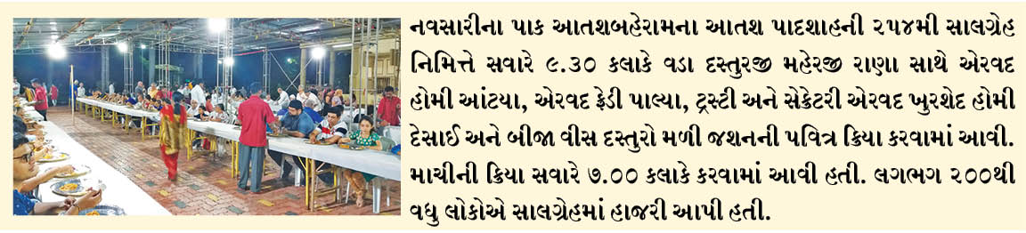 નવસારીના પાક આતશબહેરામના આતશ પાદશાહની 254મી સાલગ્રેહ નિમિત્તે સવારે 9.30 કલાકે વડા દસ્તુરજી મહેરજી રાણા સાથે એરવદ હોમી આંટયા, એરવદ ફ્રેડી પાલ્યા, ટ્રસ્ટી અને સેક્રેટરી એરવદ ખુરશેદ હોમી દેસાઈ અને બીજા વીસ દસ્તુરો મળી જશનની પવિત્ર ક્રિયા કરવામાં આવી. માચીની ક્રિયા સવારે 7.00 કલાકે કરવામાં આવી હતી. લગભગ 200થી વધુ લોકોએ સાલગ્રેહમાં હાજરી આપી હતી.
