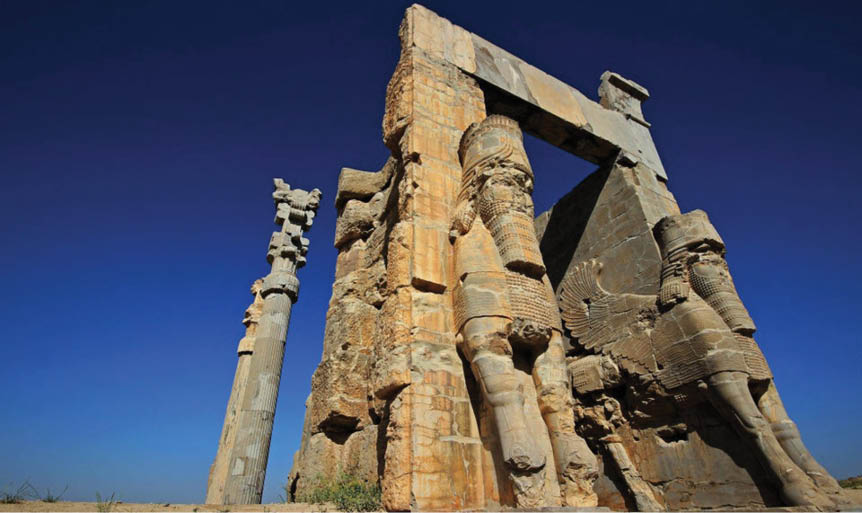 The Persian Gopatha: The quintessential feature of Persian architecture was its eclectic nature with elements of Assyrian, Egyptian, Median and Hellenistic features and iconography all incorporated in a seamless collage, yet producing a unique Persian identity seen in the finished product. Achaemenid architectural heritage, beginning with the expansion of the empire around 550 B.C.E, was a period of artistic growth that left an extraordinary architectural legacy, ranging from Cyrus the Great’s step-pyramidical tomb in Pasargadae to the splendid structures of the opulent Spring capital of Persepolis, near modern-day Shiraz, in Iran. Similar architectural infrastructures were also erected at Susa (Province of Khuzestan in Iran) and Ecbatana (modern Hamadan) by Darius the Great, serving similar functions as Persepolis, including reception of foreign dignitaries and delegates, performance of imperial ceremonies and duties and also housing the kings.