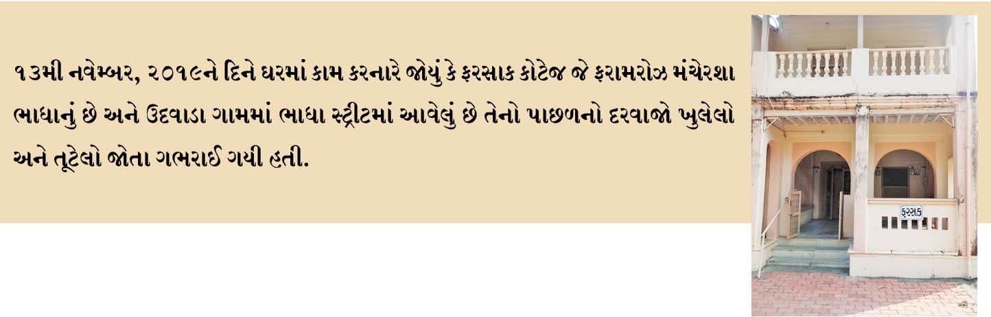 13મી નવેમ્બર, 2019ને દિને ઘરમાં કામ કરનારે જોયું કે ફરસાક કોટેજ જે ફરામરોઝ મંચેરશા ભાધાનું છે અને ઉદવાડા ગામમાં ભાધા સ્ટ્રીટમાં આવેલું છે તેનો પાછળનો દરવાજો ખુલેલો અને તૂટેલો જોતા ગભરાઈ ગયી હતી. તેણે લૂંટાયેલા ઘરની સામે સ્થિત ઉદવાડાના લોકપ્રિય ‘ઈરાની બેકરી’ ના માલિક રોહિન્ટન ઇરાનીને જાણ કરી, જેમણે શાહીન ઇરાનીને તાત્કાલિક હાજરી આપવા પારડી પોલીસ સ્ટેશન બોલાવ્યો હતો. ગયા મહિને જ 4થી ઓકટોબર, 2019ના દિને ઉદવાડામાં રોહન્ટિન ઈરાનીના ઈનલોસનું ઘર જે ભરડા પરિવારની માલિકીનું છે તેને તોડી પાડી તેમાંથી સોનાના આભૂષણ, રોકડ (રૂ. 1.5 લાખ) અને અન્ય કિંમતી ચીજો લૂંટી લીધા હતા. ભાધાના ઘરને તેજ રીતે લુંટવામાં આવ્યું હતું. જોકે આ હાલની લૂંટ ઇરાની બેકરીની ખૂબ જ નજીકમાં થઈ છે, જ્યાં સીસીટીવી કેમેરા ફીટ કરેલા છે, પણ ફૂટેજમાંથી કંઈ વધુ જાણવા મળ્યું નથી. ઉદવાડાના રહેવાસીઓ છેલ્લા કેટલાક સમયમાં દસથી વધુ લૂંટનો ભોગ બન્યા છે. પીએસઆઈ શક્તિ સિંહ ઝાલા જે હાલમાં પારડી પોલીસ સ્ટેશનમાં ટ્રાન્સફર થયા છે અને આ કેસનો ચાર્જ હાથમાં લીધો છે અને તેમણે ખાતરી આપી છે કે ગુજરાતમાં થઈ રહેલી લૂંટની તળિયે પહોંચવા માટે તેઓ તેમના સંસાધનોનો ઉપયોગ કરશે. કર્ટસી- પારસી ખબર