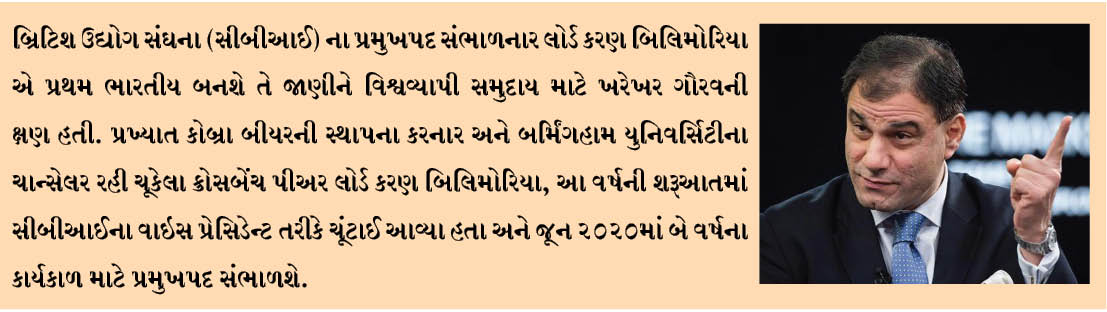 બ્રિટિશ ઉદ્યોગ સંઘના (સીબીઆઈ) ના પ્રમુખપદ સંભાળનાર લોર્ડ કરણ બિલિમોરિયા એ પ્રથમ ભારતીય બનશે તે જાણીને વિશ્ર્વવ્યાપી સમુદાય માટે ખરેખર ગૌરવની ક્ષણ હતી. ધ વોઈસ ઓફ બ્રિટીશ ઈન્ડસ્ટ્રી જે ઉદ્યોગમાં 1,90,000 સભ્યો છે જે 7 મિલિયન લોકોને રોજગારી આપે છે. પ્રખ્યાત કોબ્રા બીયરની સ્થાપના કરનાર અને બર્મિંગહામ યુનિવર્સિટીના ચાન્સેલર રહી ચૂકેલા ક્રોસબેંચ પીઅર લોર્ડ કરણ બિલિમોરિયા, આ વર્ષની શરૂઆતમાં સીબીઆઈના વાઇસ પ્રેસિડેન્ટ તરીકે ચૂંટાઈ આવ્યા હતા અને જૂન 2020માં બે વર્ષના કાર્યકાળ માટે પ્રમુખપદ સંભાળશે. 57 વર્ષીય લોર્ડ બિલિમોરિયા એક પારસી છે, જેના પિતા લેફ્ટનન્ટ જનરલ ફરીદૂન નોશીર બિલિમોરિયા (લોકપ્રિય જનરલ બિલી તરીકે જાણીતા હતા) હતા.