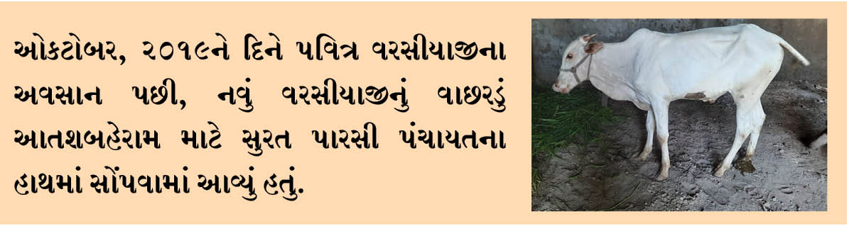 સુરતના શહેનશાહી આતશબહેરામમાં તા. 20મી ઓકટોબર, 2019ને દિને પવિત્ર વરસીયાજીના અવસાન પછી, નવું વરસીયાજીનું વાછરડું આતશબહેરામ માટે સુરત પારસી પંચાયતના હાથમાં સોંપવામાં આવ્યું હતું. નાસિકના ફાર્મ હાઉસમાં રાખવામાં આવેલ ચાર મહિનાના વરાસીયાજી વાછરડા માટે, ઇજાવાની વિધિ (યજશ્ને) 9 નવેમ્બર, 2019 ના રોજ કરવામાં આવશે.