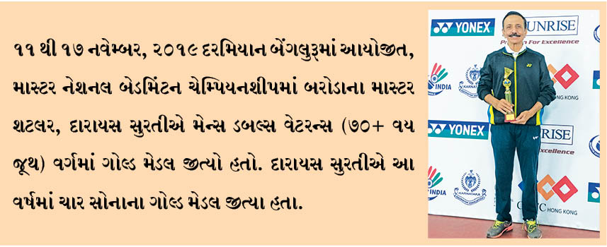 11 થી 17 નવેમ્બર, 2019 દરમિયાન બેંગલુરૂમાં આયોજીત, માસ્ટર નેશનલ બેડમિંટન ચેમ્પિયનશીપમાં બરોડાના માસ્ટર શટલર, દારાયસ સુરતીએ મેન્સ ડબલ્સ વેટરન્સ (70+ વય જૂથ) વર્ગમાં ગોલ્ડ મેડલ જીત્યો હતો. દારાયસ સુરતીએ આ વર્ષમાં ચાર સોનાના ગોલ્ડ મેડલ જીત્યા હતા.