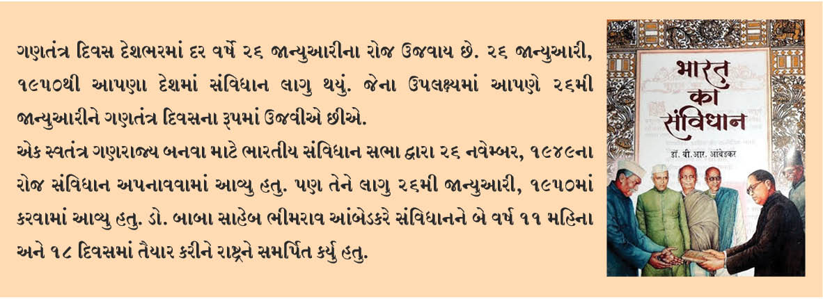 ગણતંત્ર દિવસ દેશભરમાં દર વર્ષે 26 જાન્યુઆરીના રોજ ઉજવાય છે. 26 જાન્યુઆરી, 1950થી આપણા દેશમાં સંવિધાન લાગુ થયું. જેના ઉપલક્ષ્યમાં આપણે 26મી જાન્યુઆરીને ગણતંત્ર દિવસના રૂપમાં ઉજવીએ છીએ.