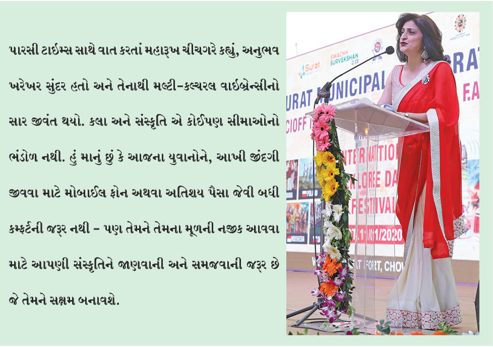 પારસી ટાઇમ્સ સાથે વાત કરતાં મહારૂખ ચીચગરે કહ્યું, અનુભવ ખરેખર સુંદર હતો અને તેનાથી મલ્ટી-કલ્ચરલ વાઇબ્રેન્સીનો સાર જીવંત થયો. કલા અને સંસ્કૃતિ એ કોઈપણ સીમાઓનો ભંડોળ નથી. હું માનું છું કે આજના યુવાનોને, આખી જીંદગી જીવવા માટે મોબાઈલ ફોન અથવા અતિશય પૈસા જેવી બધી કમ્ફર્ટની જરૂર નથી – પણ તેમને તેમના મૂળની નજીક આવવા માટે આપણી સંસ્કૃતિને જાણવાની અને સમજવાની જરૂર છે જે તેમને સક્ષમ બનાવશે.