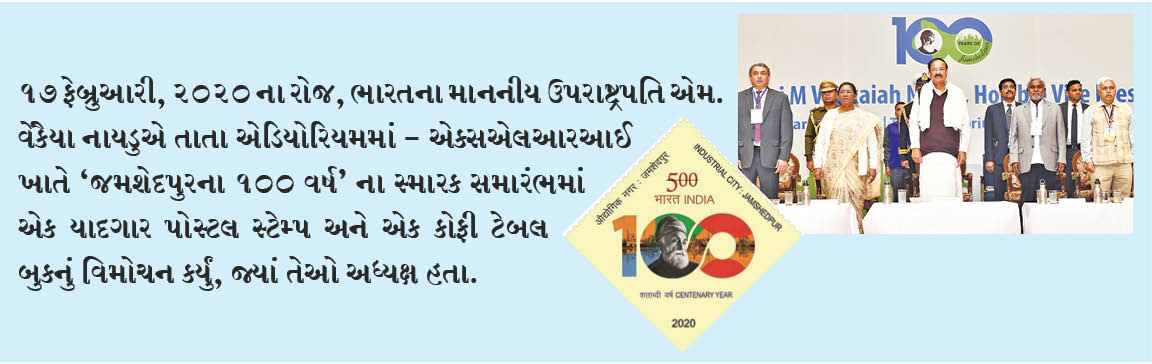17 ફેબ્રુઆરી, 2020 ના રોજ, ભારતના માનનીય ઉપરાષ્ટ્રપતિ એમ. વેંકૈયા નાયડુએ તાતા એડિયોરિયમમાં – એક્સએલઆરઆઈ ખાતે ‘જમશેદપુરના 100 વર્ષ’ ના સ્મારક સમારંભમાં એક યાદગાર પોસ્ટલ સ્ટેમ્પ અને એક કોફી ટેબલ બુકનું વિમોચન કર્યું, જ્યાં તેઓ અધ્યક્ષ હતા.