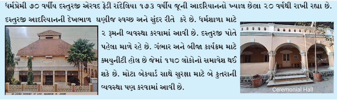 ધર્મપ્રેમી 70 વર્ષીય દસ્તુરજી એરવદ ફ્રેડી રાંદેલિયા 173 વર્ષીય જૂની આદરિયાનનો ખ્યાલ છેલ્લા 20 વર્ષથી રાખી રહ્યા છે. દસ્તુરજી આદરિયાનની દેખભાળ ઘણીજ સ્વચ્છ અને સુંદર રીતે કરે છે. ધર્મશાળા માટે 2 રૂમની વ્યવસ્થા કરવામાં આવી છે. દસ્તુરજી પોતે પહેલા માળે રહે છે. ગંભાર અને બીજા કાર્યક્રમ માટે ક્મયુનીટી હોલ છે જેમાં 150 લોકોનો સમાવેશ થઈ શકે છે. મોટા બેકયાર્ડ સાથે સુરક્ષા માટે બે કુતરાની વ્યવસ્થા પણ કરવામાં આવી છે.
