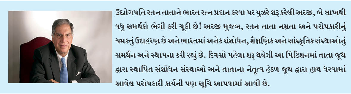 ઉદ્યોગપતિ રતન તાતાને ભારત રત્ન પ્રદાન કરવા ભવફક્ષલય.જ્ઞલિ પર યુઝરે શરૂ કરેલી અરજી, બે લાખથી વધુ સમર્થકો ભેગી કરી ચૂકી છે! અરજી મુજબ, રતન તાતા નમ્રતા અને પરોપકારીનું ચમકતું ઉદાહરણ છે અને ભારતમાં અનેક સંશોધન, શૈક્ષણિક અને સાંસ્કૃતિક સંસ્થાઓનું સમર્થન અને સ્થાપના કરી રહ્યું છે. દિવસો પહેલા શરૂ થયેલી આ પિટિશનમાં તાતા જૂથ દ્વારા સ્થાપિત સંશોધન સંસ્થાઓ અને તાતાના નેતૃત્વ હેઠળ જૂથ દ્વારા હાથ ધરવામાં આવેલ પરોપકારી કાર્યની પણ સૂચિ આપવામાં આવી છે.