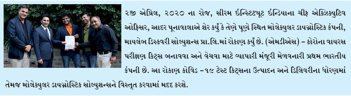 ચીફ એક્ઝિક્યુટિવ ઓફિસર, આદર પૂનાવાલાએ શેર કર્યું કે તેણે પૂણે સ્થિત મોલેક્યુલર ડાયગ્નોસ્ટિક કંપની, માયલેબ ડિસ્કવરી સોલ્યુશન્સ પ્રા.લિ.માં રોકાણ કર્યું છે. (એમડીએસ) – કોરોના વાયરસ પરીક્ષણ કિટ્સ બનાવવા અને વેચવા માટે વ્યાપારી મંજૂરી મેળવનારી પ્રથમ ભારતીય કંપની છે. આ રોકાણ કોવિડ -19 ટેસ્ટ કિટ્સના ઉત્પાદન અને ડિલિવરીના ધોરણમાં તેમજ મોલેક્યુલર ડાયગ્નોસ્ટિક સોલ્યુશન્સને વિસ્તૃત કરવામાં મદદ કરશે.