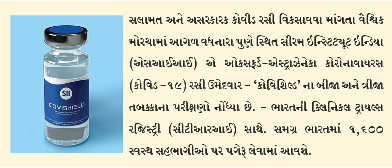 સલામત અને અસરકારક કોવીડ રસી વિકસાવવા માંગતા વૈશ્ર્વિક મોરચામાં આગળ વધનારા પુણે સ્થિત સીરમ ઇન્સ્ટિટ્યૂટ ઇન્ડિયા (એસઆઈઆઈ) એ ઓકસફર્ડ-એસ્ટ્રાઝેનેકા કોરોનાવાયરસ (કોવિડ -19) રસી ઉમેદવાર – ‘કોવિશિલ્ડ’ ના બીજા અને ત્રીજા તબક્કાના પરીક્ષણો નોંધ્યા છે. – ભારતની ક્લિનિકલ ટ્રાયલ્સ રજિસ્ટ્રી (સીટીઆરઆઈ) સાથે. સમગ્ર ભારતમાં 1,600 સ્વસ્થ સહભાગીઓ પર પગેરૂ લેવામાં આવશે.
