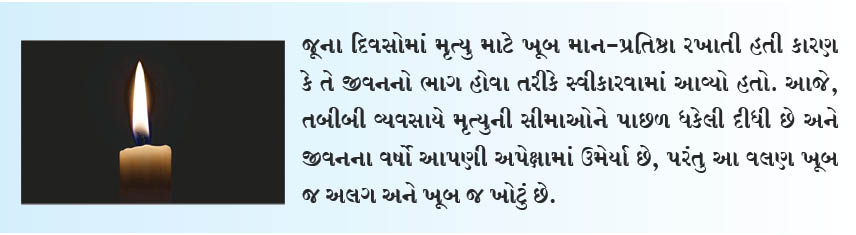 જૂના દિવસોમાં મૃત્યુ માટે ખૂબ માન-પ્રતિષ્ઠા રખાતી હતી કારણ કે તે જીવનનો ભાગ હોવા તરીકે સ્વીકારવામાં આવ્યો હતો. આજે, તબીબી વ્યવસાયે મૃત્યુની સીમાઓને પાછળ ધકેલી દીધી છે અને જીવનના વર્ષો આપણી અપેક્ષામાં ઉમેર્યા છે, પરંતુ આ વલણ ખૂબ જ અલગ અને ખૂબ જ ખોટું છે. પહેલાના દિવસોમાં, ખૂબ જ વૃદ્ધ અને ખૂબ માંદા લોકો તેમના પોતાના ઘરોમાં, આરામથી અને ખૂબ જ શાંતિપૂર્ણ રીતે મૃત્યુની તરફ જતા હતા. આસપાસના તેમના પ્રિયજનો સાથે, ક્યારેક પથારીમાં પડેલી વ્યક્તિને દિલાસો આપતા શબ્દને સંબોધન કરતા. સુનાવણીની ભાવના, હંમેશાં નિસ્તેજ થવાની છેલ્લા વખતને, જીવંત રાખવામાં આવતું હતું, અને વૃદ્ધ વ્યક્તિને અંતિમ ક્ષણ સુધી પ્રેમ અને પ્રિય હોવાનો અહેસાસ અપાવવામાં આવતો હતો. આજે તે કેટલું અલગ અને ક્રૂર છે. હોસ્પિટલમાં મૂકવા માટે વૃદ્ધ વ્યક્તિઓ, ઘણા કિસ્સાઓમાં, તેમના ખૂબ જ પ્રિય ઘરોથી બળજબરીથી દૂર લઈ જવામાં આવે છે જ્યાં તેઓ તેમના બધા પુખ્ત જીવન જીવે છે (અને જ્યાં તેઓ સલામત લાગે છે) એકવાર ત્યાં પહોંચ્યા પછી, તેઓની તબિયત ઝડપથી બગડે છે કારણ કે ત્યાં કોઈ પ્રેમ આપનાર નથી અને માનસિક કે ભાવનાત્મક આશ્ર્વાસન આપનાર નથી. ત્યાં કોઈ કુટુંબ, મિત્રો અથવા પડોશીઓ નથી – ફક્ત અજાણ્યાઓ (જોકે તેઓ માયાળુ છે) ડોકટરો અને નર્સોના કપડામાં. આમ, વૃદ્ધ વ્યક્તિ કે જે ઘરે શાંતિથી મૃત્યુ પામવા માંગે છે તેના છેલ્લા કેટલાક દિવસો અજ્ઞાન હોસ્પિટલના પલંગમાં ઓવર વર્ક ડોકટરો અને વ્યસ્ત નર્સો સાથે વિતાવે છે જેઓ પોતાનું શ્રેષ્ઠ કાર્ય કરે છે. પરંતુ મૃત્યુ ઘણીવાર એકલતામાં આવે છે. મૃત્યુ જે મિત્ર તરીકે આવવો જોઈએ, તેના બદલે ટ્યુબ, સિરીંજ, કઠોર લાઇટ્સ, કેથેટર્સના રૂપમાં આવે છે. જ્યારે એક જનમ સમાપ્ત થાય છે ત્યારે બહાર નીકળવાનો રસ્તો ખુબ દુ:ખદ હોય છે, કારણ કે આજે મોતને પાછળની તરફ ખેંચવાની કોશિશ કરવામાં આવે છે. આપણું આધુનિક વિજ્ઞાન જેનો ઇલાજ કરી શકતું નથી, તે લંબાવે છે.