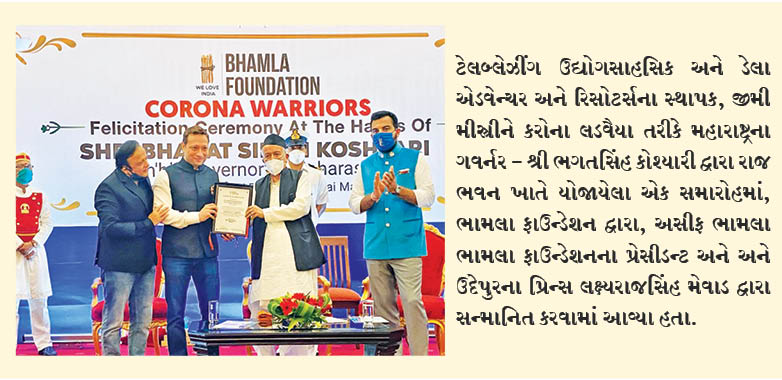 ટેલબ્લેઝીંગ ઉદ્યોગસાહસિક અને ડેલા એડવેન્ચર અને રિસોટર્સના સ્થાપક, જીમી મીસ્ત્રીને કરોના લડવૈયા તરીકે મહારાષ્ટ્રના ગવર્નર – શ્રી ભગતસિંહ કોશ્યારી દ્વારા રાજ ભવન ખાતે યોજાયેલા એક સમારોહમાં,