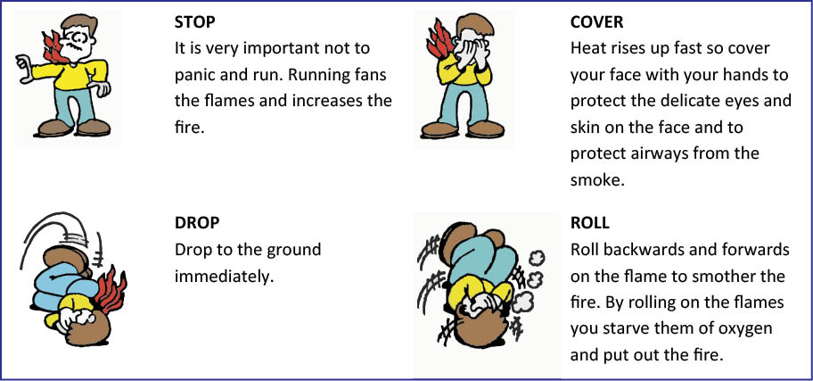 To minimize a burn injury when clothes catch fire, it is very essential to STOP, DRO, and ROLL. Burns are among the most painful of injuries and the third leading cause of unintentional death. The hands, groin, face and lungs are at particular risk because they are delicate structures and easily injured.