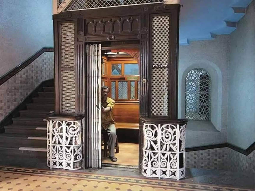 The Navsari Building houses one of the oldest lifts in the city today. The wood panelled elevator is operated manually using a crankshaft and is hydraulically operated.