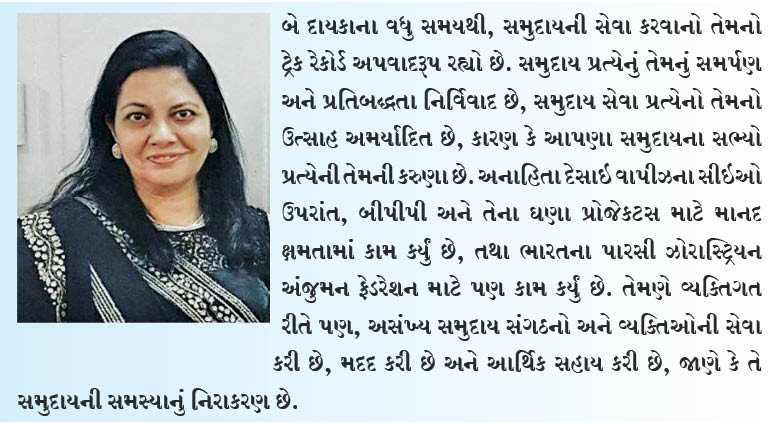 બે દાયકાના વધુ સમયથી, સમુદાયની સેવા કરવાનો તેમનો ટ્રેક રેકોર્ડ અપવાદરૂપ રહ્યો છે. સમુદાય પ્રત્યેનું તેમનું સમર્પણ અને પ્રતિબદ્ધતા નિર્વિવાદ છે, સમુદાય સેવા પ્રત્યેનો તેમનો ઉત્સાહ અમર્યાદિત છે, કારણ કે આપણા સમુદાયના સભ્યો પ્રત્યેની તેમની કરુણા છે. અનાહિતા દેસાઇ વાપીઝના સીઇઓ ઉપરાંત, બીપીપી અને તેના ઘણા પ્રોજેકટસ માટે માનદ ક્ષમતામાં કામ કર્યું છે, તથા ભારતના પારસી ઝોરાસ્ટ્રિયન અંજુમન ફેડરેશન માટે પણ કામ કર્યું છે. તેમણે વ્યક્તિગત રીતે પણ, અસંખ્ય સમુદાય સંગઠનો અને વ્યક્તિઓની સેવા કરી છે, મદદ કરી છે અને આર્થિક સહાય કરી છે, જાણે કે તે સમુદાયની સમસ્યાનું નિરાકરણ છે.