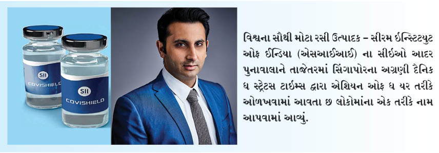 વિશ્ર્વના સૌથી મોટા રસી ઉત્પાદક – સીરમ ઇન્સ્ટિટયુટ ઓફ ઈન્ડિયા (એસઆઈઆઈ) ના સીઇઓ આદર પુનાવાલાને તાજેતરમાં સિંગાપોરના અગ્રણી દૈનિક ધ સ્ટ્રેટસ ટાઇમ્સ દ્વારા એશિયન ઓફ ધ યર તરીકે ઓળખવામાં આવતા છ લોકોમાંના એક તરીકે નામ આપવામાં આવ્યું.