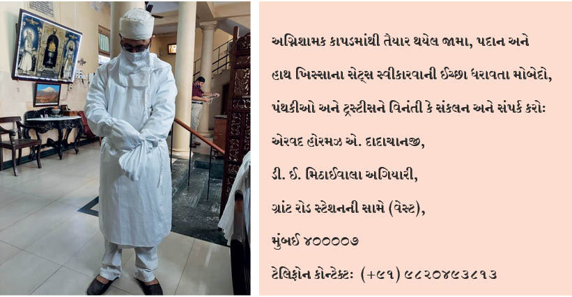 અગ્નિશામક કાપડમાંથી તૈયાર થયેલ જામા, પદાન અને હાથ ખિસ્સાના સેટ્સ સ્વીકારવાની ઈચ્છા ધરાવતા મોબેદો, પંથકીઓ અને ટ્રસ્ટીસને વિનંતી કે સંકલન અને સંપર્ક કરો: