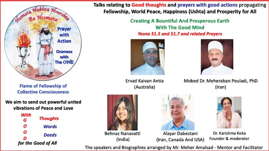On 4th July, 2021, the sixth episode of the increasingly popular religious series, ‘Ba Humata’ celebrates the spirit of our prophet in ‘Creating A Bountiful And Prosperous Earth With The Good Mind’ (Yasna 51.5 and 51.7 and related prayers). The Webinar will feature Er. Kaivan Antia (Australia); Mobed Dr. Mehraban Pouladi (Iran); Behnaz Nanavatti (India); and Alayar Dabestani (Iran, Canada and USA), along with Founder, Host and Moderator of Ba Humata – Zarathushti Neuro-scientist from Cambridge University (UK) – Dr. Karishma Koka.