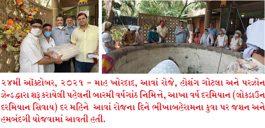 24મી ઑક્ટોબર, 2021 – માહ ખોરદાદ, આવાં રોજે, હોશંગ ગોટલા અને પરઝોન ઝેન્ડ દ્વારા શરૂ કરાયેલી પહેલની બારમી વર્ષગાંઠ નિમિત્તે, આખા વર્ષ દરમિયાન (લોકડાઉન દરમિયાન સિવાય) દર મહિને આવાં રોજના દિને ભીખાબહેરામના કુવા પર જશન અને હમબંદગી યોજવામાં આવતી હતી.
