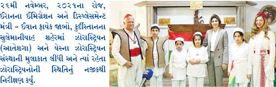 26મી નવેમ્બર, 2021ના રોજ, ઈરાનના ઈમિગ્રેશન અને ડિસ્પ્લેસમેન્ટ મંત્રી – ઈવાન ફાયેક જાબો, કુર્દીસ્તાનના સુલેમાનીયાહ શહેરમાં ઝોરાસ્ટ્રિયન (આતેશગા) અને યેસ્ના ઝોરાસ્ટ્રિયન સંસ્થાની મુલાકાત લીધી અને ત્યાં રહેતા ઝોરાસ્ટ્રિયનોની સ્થિતિનું નજીકથી નિરીક્ષણ કર્યું. કુર્દીસ્તાન ક્ષેત્રના અવકાફ અને ધાર્મિક બાબતોના મંત્રાલયના ઝોરાસ્ટ્રિયન પ્રતિનિધિ અવત હુસમ અલ-દિનના નેતૃત્વમાં સંખ્યાબંધ ઝોરાસ્ટ્રિયનો દ્વારા તેમનું સ્વાગત કરવામાં આવ્યું હતું તેમજ અશ્રવાન કાદિરુક – સુલેમાનીયાહમાં ઝોરોસ્ટ્રિયન મંદિરના સુપરવાઈઝર; આઝાદ સઈદ – યેસ્ના ઓર્ગેનાઈઝેશનના સુપરવાઈઝિંગ ડિરેક્ટર અને ઝોરાસ્ટ્રિયન હાઈ કમિશનના સંખ્યાબંધ સભ્યો પણ હાજર રહ્યા હતા.