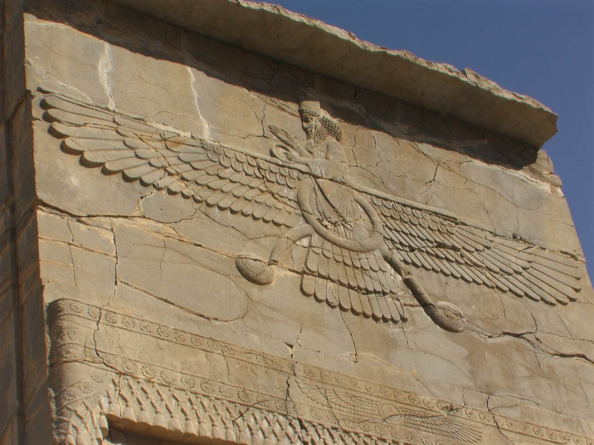 The Winged Disc was featured in early Egyptian designs as a sun-disc with wings, representing the hawk-god Horus; believed to incarnate in the Pharoah, and signified the Pharoah’s right to rule by divine kingship. In later Assyrian art, it had a similar significance. It was during the Achaemenids rule, at Persepolis, that it reached its fine perfection. Shown at most places in its full glory, in places it is found with its wings angulated, as if in flight and where lack of space necessitates, the human body is even omitted. The Winged Disc of the Persians above the King represented Royal Glory, and was called khvarenah in the Avestan language.