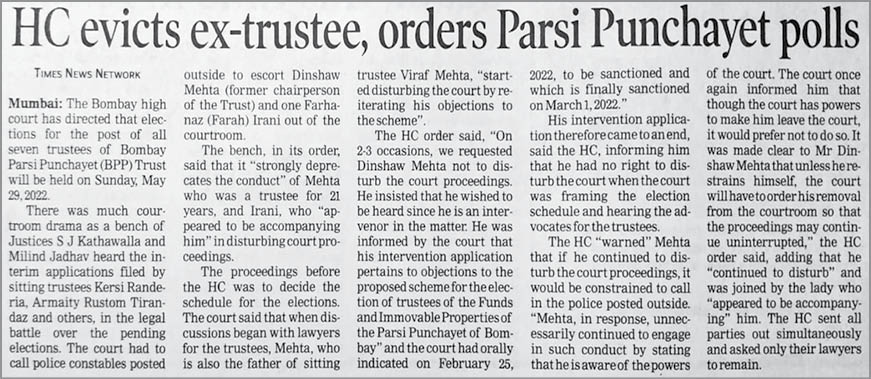 As community members would recall, on 22nd February, when the High Court was to announce its decision as regards finalizing the Election Date and the renewed Scheme of Elections, Dinshaw Mehta came in with some last-minute objections and subverting the legal process due for court submissions, decided to tender him across the bar directly to the judge, himself!