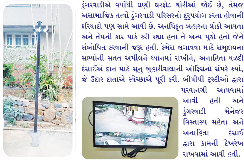 ડુંગરવાડીએ વર્ષોથી ઘણી ઘરફોડ ચોરીઓ જોઈ છે, તેમજ અસામાજિક તત્વો ડુંગરવાડી પરિસરનો દુરુપયોગ કરતા હોવાની ફરિયાદો પણ સામે આવી છે. અનધિકૃત બહારના લોકો આવતા અને તેમની કાર પાર્ક કરી રહ્યા હતા તે અન્ય મુદ્દો હતો જેને સંબોધિત કરવાની જરૂર હતી. કેમેરા લગાવવા માટે સમુદાયના સભ્યોની સતત અપીલને ધ્યાનમાં રાખીને, અનાહિતા યઝદી દેસાઈએ દાન માટે સૂનુ બુહારીવાલાની ઑફિસનો સંપર્ક કર્યો, જે ઉદાર દાતાએ સ્વેચ્છાએ પૂરી કરી. બીપીપી ટ્રસ્ટીઓ દ્વારા પરવાનગી આપવામાં આવી હતી અને ડુંગરવાડી મેનેજર વિસ્તાસ્પ મહેતા અને અનાહિતા દેસાઈ દ્વારા કામની દેખરેખ રાખવામાં આવી હતી.