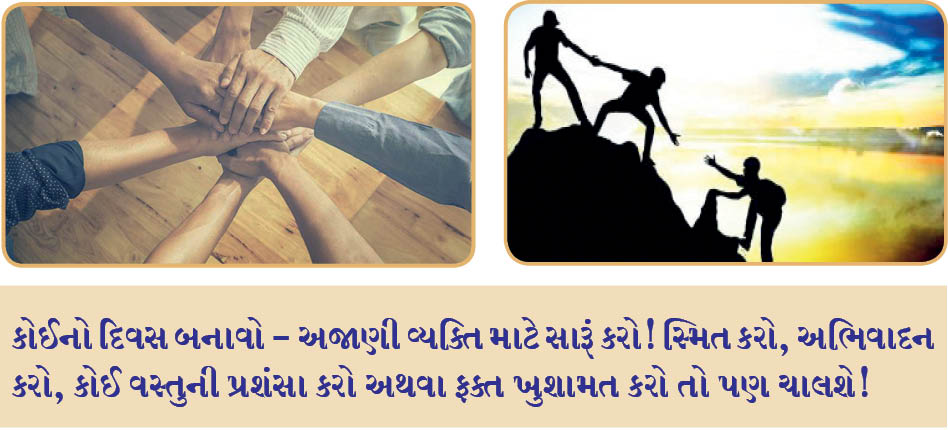 * કોઈનો દિવસ બનાવો – અજાણી વ્યક્તિ માટે સારૂં કરો! સ્મિત કરો, અભિવાદન કરો, કોઈ વસ્તુની પ્રશંસા કરો અથવા ફક્ત ખુશામત કરો તો પણ ચાલશે!