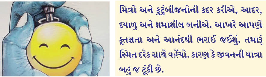 તો મિત્રો અને કુટુંબીજનોની કદર કરીએ, આદર, દયાળુ અને ક્ષમાશીલ બનીએ. આખરે આપણે કૃતજ્ઞતા અને આનંદથી ભરાઈ જઈશું. તમારૂં સ્મિત દરેક સાથે વહેંચો. કારણ કે જીવનની યાત્રા બહુ જ ટૂંકી છે.
