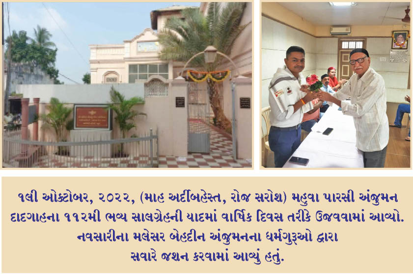 1લી ઓક્ટોબર, 2022, (માહ અર્દીબહેસ્ત, રોજ સરોશ) મહુવા પારસી અંજુમન દાદગાહના 112મી ભવ્ય સાલગ્રેહની યાદમાં વાર્ષિક દિવસ તરીકે ઉજવવામાં આવ્યો. નવસારીના મલેસર બેહદીન અંજુમનના ધર્મગુરૂઓ દ્વારા સવારે જશન કરવામાં આવ્યું હતું.