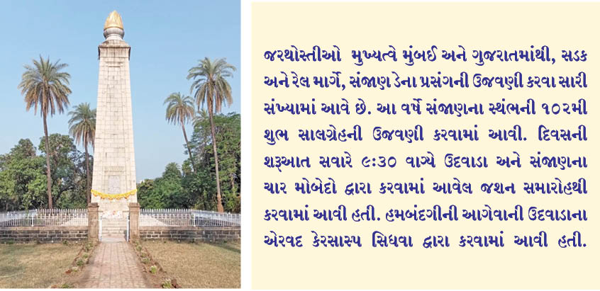 સંજાણ ડે દર વર્ષે આપણા પૂર્વજો પ્રત્યે કૃતજ્ઞતાના દિવસ તરીકે અને સ્થાનિક શાસકો દ્વારા સ્વીકારવામાં આવે છે તે માટે ખૂબ જ ધામધૂમથી ઉજવવામાં આવે છે. જરથોસ્તીઓ મુખ્યત્વે મુંબઈ અને ગુજરાતમાંથી, સડક અને રેલ માર્ગે, સંજાણ ડેના પ્રસંગની ઉજવણી કરવા સારી સંખ્યામાં આવે છે. આ વર્ષે સંજાણના સ્થંભની 102મી શુભ સાલગ્રેહની ઉજવણી કરવામાં આવી. દિવસની શરૂઆત સવારે 9:30 વાગ્યે ઉદવાડા અને સંજાણના ચાર મોબેદો દ્વારા કરવામાં આવેલ જશન સમારોહથી કરવામાં આવી હતી. હમબંદગીની આગેવાની ઉદવાડાના એરવદ કેરસાસ્પ સિધવા દ્વારા કરવામાં આવી હતી.
