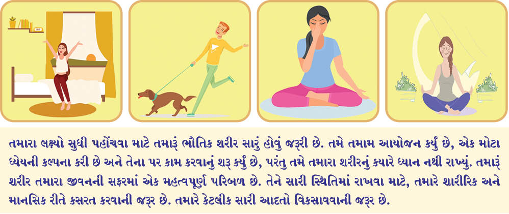 તમારા લક્ષ્યો સુધી પહોંચવા માટે તમારૂં ભૌતિક શરીર સારું હોવું જરૂરી છે. તમે તમામ આયોજન કર્યું છે, એક મોટા ધ્યેયની કલ્પના કરી છે અને તેના પર કામ કરવાનું શરૂ કર્યું છે, પરંતુ તમે તમારા શરીરનું કયારે ધ્યાન નથી રાખ્યું. તમારૂં શરીર તમારા જીવનની સફરમાં એક મહત્વપૂર્ણ પરિબળ છે. તેને સારી સ્થિતિમાં રાખવા માટે, તમારે શારીરિક અને માનસિક રીતે કસરત કરવાની જરૂર છે. તમારે કેટલીક સારી આદતો વિકસાવવાની જરૂર છે.