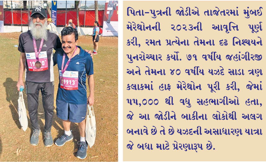 71 વર્ષીય જહાંગીરજી અને તેમના 40 વર્ષીય યઝદે સાડા ત્રણ કલાકમાં હાફ મેરેથોન પૂરી કરી, જેમાં 55,000 થી વધુ સહભાગીઓ હતા, જેમાં મોટી સંખ્યામાં સેપ્ટ્યુએજનેરિયન્સનો સમાવેશ થાય છે. જે આ જોડીને બાકીના લોકોથી અલગ બનાવે છે તે છે યઝદની અસાધારણ યાત્રા જે બધા માટે પ્રેરણારૂપ છે. ગંભીર ગૂંચવણો સાથે 1983માં જન્મેલા યઝદ ચાર વર્ષની ઉંમર સુધી ઊભા રહેવામાં પણ અસમર્થ હતા. 1987 અને 2000 ની વચ્ચે, યઝદે મોટી શસ્ત્રક્રિયાઓ (એક ઓપન હાર્ટ અને અન્ય ન્યુરો-સર્જરીઓ સહિત)ની શ્રેણીમાંથી પસાર થઈ, જેના કારણે તે ગંભીર જન્મજાત વિકલાંગતાઓને દૂર કરવામાં સક્ષમ બન્યા. આજે યઝદે અનેક ક્ષેત્રોમાં પોતાની ઓળખ બનાવી છે.