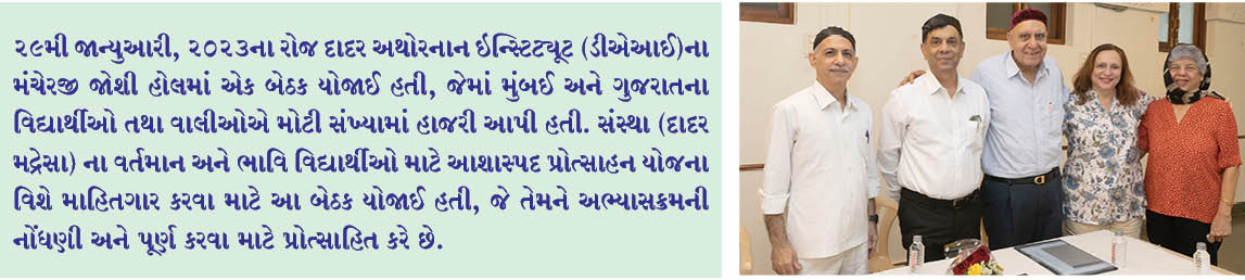 29મી જાન્યુઆરી, 2023ના રોજ દાદર અથોરનાન ઇન્સ્ટિટ્યૂટ (ડીએઆઈ)ના મંચેરજી જોશી હોલમાં એક બેઠક યોજાઈ હતી, જેમાં મુંબઈ અને ગુજરાતના વિદ્યાર્થીઓ તથા વાલીઓએ મોટી સંખ્યામાં હાજરી આપી હતી. સંસ્થા (દાદર મદ્રેસા) ના વર્તમાન અને ભાવિ વિદ્યાર્થીઓ માટે આશાસ્પદ પ્રોત્સાહન યોજના વિશે માહિતગાર કરવા માટે આ બેઠક યોજાઈ હતી, જે તેમને અભ્યાસક્રમની નોંધણી અને પૂર્ણ કરવા માટે પ્રોત્સાહિત કરે છે.