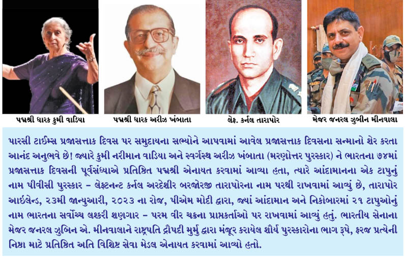 પારસી ટાઈમ્સ પ્રજાસત્તાક દિવસ પર સમુદાયના સભ્યોને આપવામાં આવેલ પ્રજાસત્તાક દિવસના સન્માનો શેર કરતા આનંદ અનુભવે છે! જ્યારે કુમી નરીમાન વાડિયા અને સ્વર્ગસ્થ અરીઝ ખંબાતા (મરણોત્તર પુરસ્કાર) ને ભારતના 74માં પ્રજાસત્તાક દિવસની પૂર્વસંધ્યાએ પ્રતિષ્ઠિત પદ્મશ્રી એનાયત કરવામાં આવ્યા હતા, ત્યારે આંદામાનના એક ટાપુનું નામ પીવીસી પુરસ્કાર – લેફ્ટનન્ટ કર્નલ અરદેશીર બરજોરજી તારાપોરના નામ પરથી રાખવામાં આવ્યું છે, તારાપોર આઇલેન્ડ, 23મી જાન્યુઆરી, 2023 ના રોજ, પીએમ મોદી દ્વારા, જ્યાં આંદામાન અને નિકોબારમાં 21 ટાપુઓનું નામ ભારતના સર્વોચ્ચ લશ્કરી શણગાર – પરમ વીર ચક્રના પ્રાપ્તકર્તાઓ પર રાખવામાં આવ્યું હતું. ભારતીય સેનાના મેજર જનરલ ઝુબિન એ. મીનવાલાને રાષ્ટ્રપતિ દ્રૌપદી મુર્મુ દ્વારા મંજૂર કરાયેલ શૌર્ય પુરસ્કારોના ભાગ રૂપે, ફરજ પ્રત્યેની નિષ્ઠા માટે પ્રતિષ્ઠિત અતિ વિશિષ્ટ સેવા મેડલ એનાયત કરવામાં આવ્યો હતો.