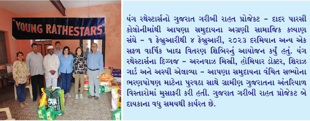 યંગ રથેસ્ટાર્સનો ગુજરાત ગરીબી રાહત પ્રોજેકટ – દાદર પારસી કોલોનીમાંથી આપણા સમુદાયના અગ્રણી સામાજિક કલ્યાણ સંઘે – 1 ફેબ્રુઆરીથી 4 ફેબ્રુઆરી, 2023 દરમિયાન અન્ય એક સફળ વાર્ષિક ખાદ્ય વિતરણ શિબિરનું આયોજન કર્યું હતું. યંગ રથેસ્ટાર્સના દિગ્ગજ – અરનવાઝ મિસ્ત્રી, હોમિયાર ડોક્ટર, શિરાઝ ગાર્ડ અને અસ્પી એલાવ્યા – આપણા સમુદાયના વંચિત સભ્યોના ભરણપોષણ માટેના પુરવઠા સાથે ગ્રામીણ ગુજરાતના અંતરિયાળ વિસ્તારોમાં મુસાફરી કરી હતી. ગુજરાત ગરીબી રાહત પ્રોજેકટ બે દાયકાના વધુ સમયથી કાર્યરત છે.