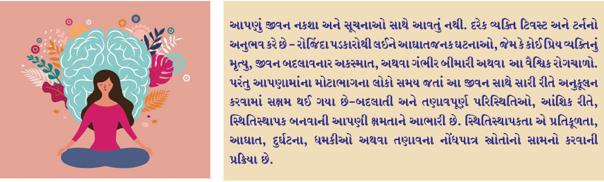 આપણું જીવન નકશા અને સૂચનાઓ સાથે આવતું નથી. દરેક વ્યક્તિ ટિવસ્ટ અને ટર્નનો અનુભવ કરે છે – રોજિંદા પડકારોથી લઈને આઘાતજનક ઘટનાઓ, જેમ કે કોઈ પ્રિય વ્યક્તિનું મૃત્યુ, જીવન બદલાવનાર અકસ્માત, અથવા ગંભીર બીમારી અથવા આ વૈશ્ર્વિક રોગચાળો. પરંતુ આપણામાંના મોટાભાગના લોકો સમય જતાં આ જીવન સાથે સારી રીતે અનુકૂલન કરવામાં સક્ષમ થઈ ગયા છે-બદલાતી અને તણાવપૂર્ણ પરિસ્થિતિઓ, આંશિક રીતે, સ્થિતિસ્થાપક બનવાની આપણી ક્ષમતાને આભારી છે. સ્થિતિસ્થાપકતા એ પ્રતિકૂળતા, આઘાત, દુર્ઘટના, ધમકીઓ અથવા તણાવના નોંધપાત્ર સ્ત્રોતોનો સામનો કરવાની