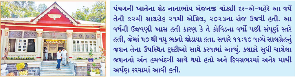 પંચગની ખાતેના શેઠ નાનાભોય બેજનજી ચોકશી દર-એ-મહેરે આ વર્ષે તેની 92મી સાલગ્રેહ 21મી એપ્રિલ, 2023ના રોજ ઉજવી હતી. આ વર્ષની ઉજવણી ખાસ હતી કારણ કે તે કોવિડના વર્ષો પછી સંપૂર્ણ સ્તરે હતી, જેમાં 50 થી વધુ ભક્તો જોડાયા હતા. સવારે 11:10 વાગ્યે સાલગ્રેહનું જશન તેના ઉપસ્થિત ટ્રસ્ટીઓ સાથે કરવામાં આવ્યું. કલાકો સુધી ચાલેલા જશનનો અંત હમબંદગી સાથે થયો હતો અને દિવસભરમાં અનેક માચી અર્પણ કરવામાં આવી હતી. શ્રોતાઓને ચાસણી, નાસ્તો અને ઠંડા પીણાની ઓફર કરવામાં આવી હતી.