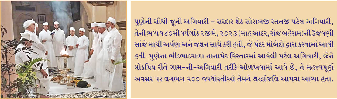 પુણેની સૌથી જૂની અગિયારી – સરદાર શેઠ સોરાબજી રતનજી પટેલ અગિયારી, તેની ભવ્ય 180મી વર્ષગાંઠ 2જી મે, 2023 (માહ આદર, રોજ બહેરામ)ની ઉજવણી સાંજે માચી અર્પણ અને જશન સાથે કરી હતી, જે પંદર મોબેદો દ્વારા કરવામાં આવી હતી. પુણેના ભીડભાડવાળા નાનાપેઠ વિસ્તારમાં આવેલી પટેલ અગિયારી, જેને લોકપ્રિય રીતે ગામ-ની-અગિયારી તરીકે ઓળખવામાં આવે છે, તે મહત્ત્વપૂર્ણ અવસર પર લગભગ 200 જરથોસ્તીઓ તેમને શ્રદ્ધાંજલિ આપવા આવ્યા હતા.
